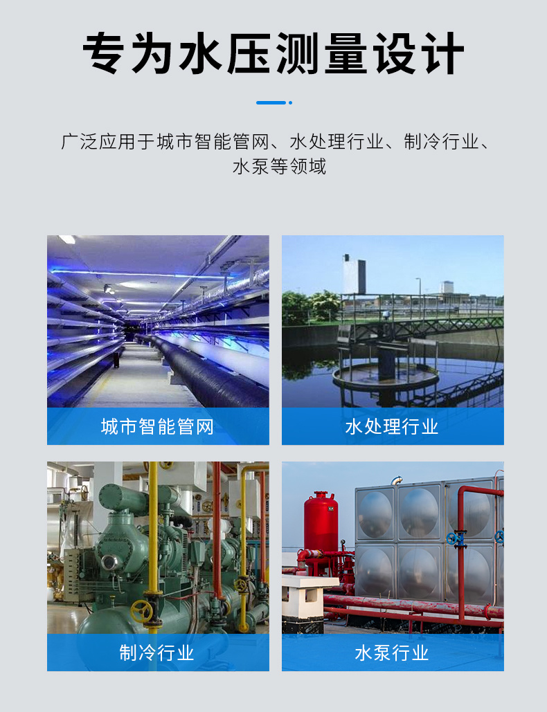应用范围:水压传感器广泛应用于水泵、城市智能管网、水处理等行业。