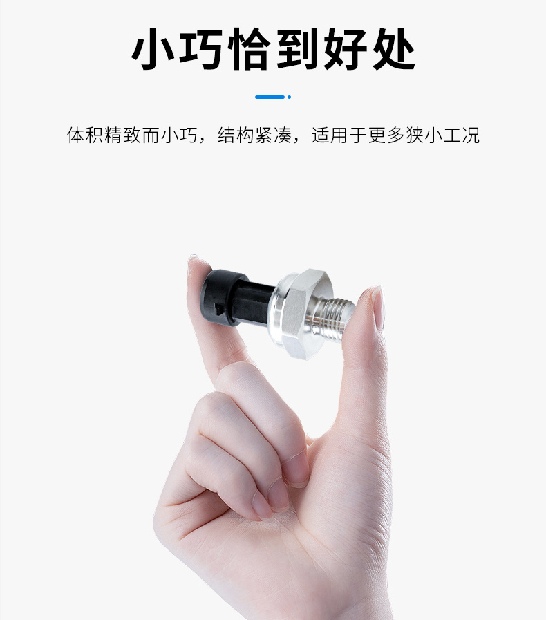 小巧型压力传感器采用全不锈钢结构,压力检测敏感元件是采用陶瓷材料经特殊工艺精制成的。激光调校工艺进行了宽温度范围的零点和满程标定,加强了变送器在工业环境中的长期稳定性。