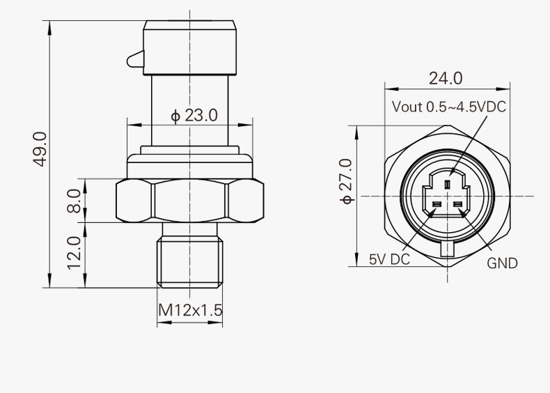 压力传感器螺纹标准有M20*1.5 、G1/4、 NPT1/4。